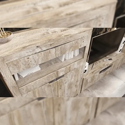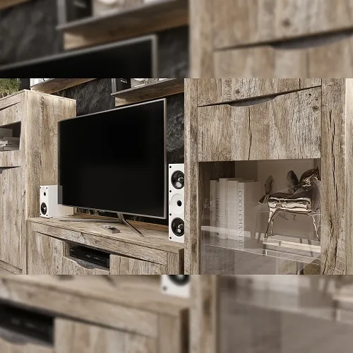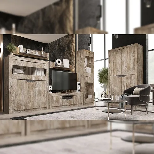 В гостиный гарнитур Ривьера входят: Тумба под ТВ, шкаф двухдверный, шкаф-витрина, пенал со стеклом, полка настенная.